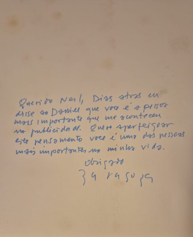 E assim foi. No dia da filmagem, tinha oito mictórios e sete homens, todos altos. Havia um mictório vazio e não tinha ninguém que tivesse à altura dos outros. Tinha somente um baixinho, motorista de uma Kombi da produtora, que estava prestes a voltar para a Espanha. Mandaram-no ocupar o mictório vazio e foi hilariante ver todo mundo com mais de 1,80m e um baixinho de 1,50m. O Cláudio Meyer, vendo a diferença, mandou o baixinho sair, mas o Neil falou alto: “Não! Deixa ele aí.” E eu havia implicado com a boina que ele usava e mandei tirá-la. Quando ele tirou, revelou-se sua careca. Aí, eu disse: “Põe de volta a boina!” E assim nasceu o “Baixinho”, com sua boina e sua sorte. “Banheiro” Leão de Ouro. É considerado pelos ingleses o melhor comercial dos últimos 50 anos